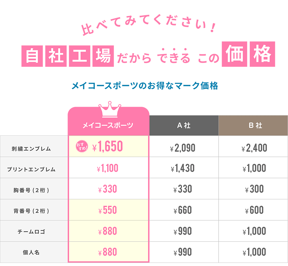 シミュレーターで思い通りのチームユニフォームがデザイン可能!気になる商品のサイズサンプルと、マーキングサンプルの貸し出しもおこなっております。 チームユニフォームに欠かせないマーキングは外注に出すことなく、全てメイコースポーツの自社工場で加工しております。 そのため、余計な時間やコストをいただかず、どこよりも速くお客様のお手元にお届けすることが可能になりました。 1秒でも早く手に入れたいユニフォームを、より正確に、ご納得いただける価格で製作いたします。 ユニフォームを手に取ったとき、メイコースポーツに頼んでよかったと思っていただけるよう精一杯努力いたします!
